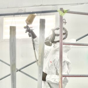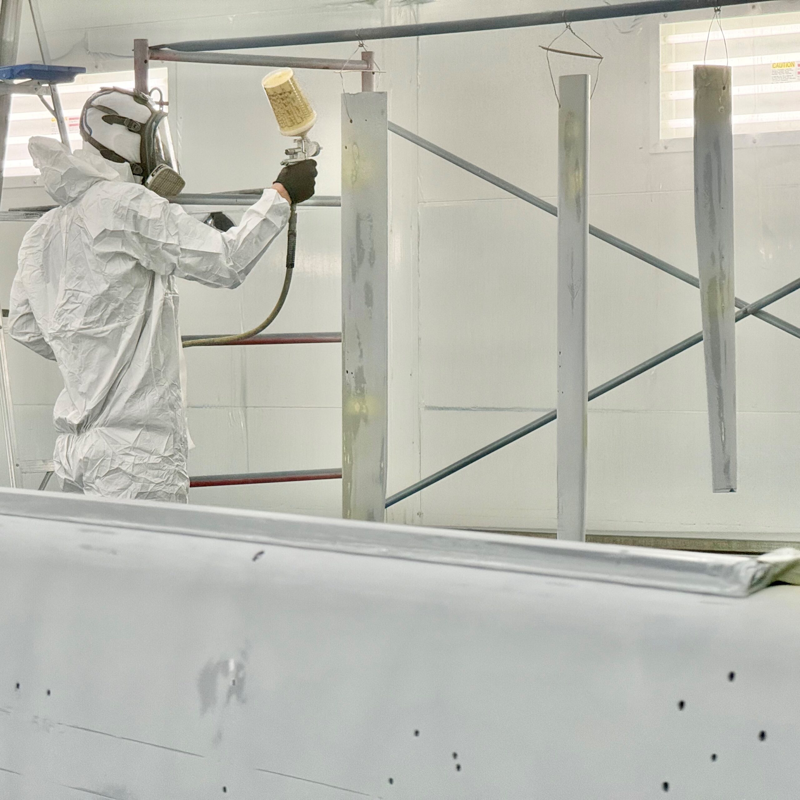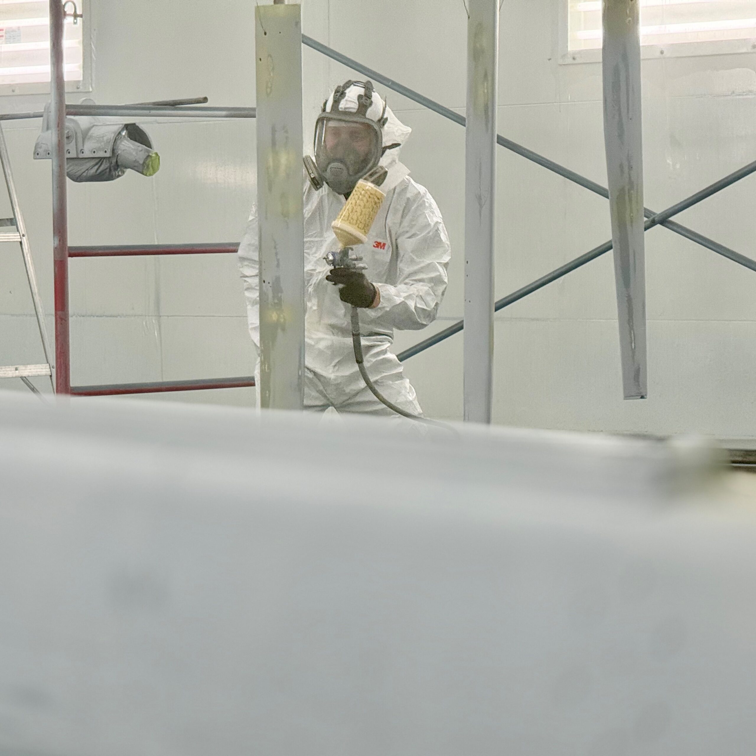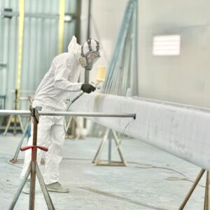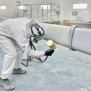 Following sanding and dust clean up, the team spot-primed the mast and spreaders for a Little Harbor 53. Now, they are making final preparations for a glossy Cloud White Awlgrip finish.