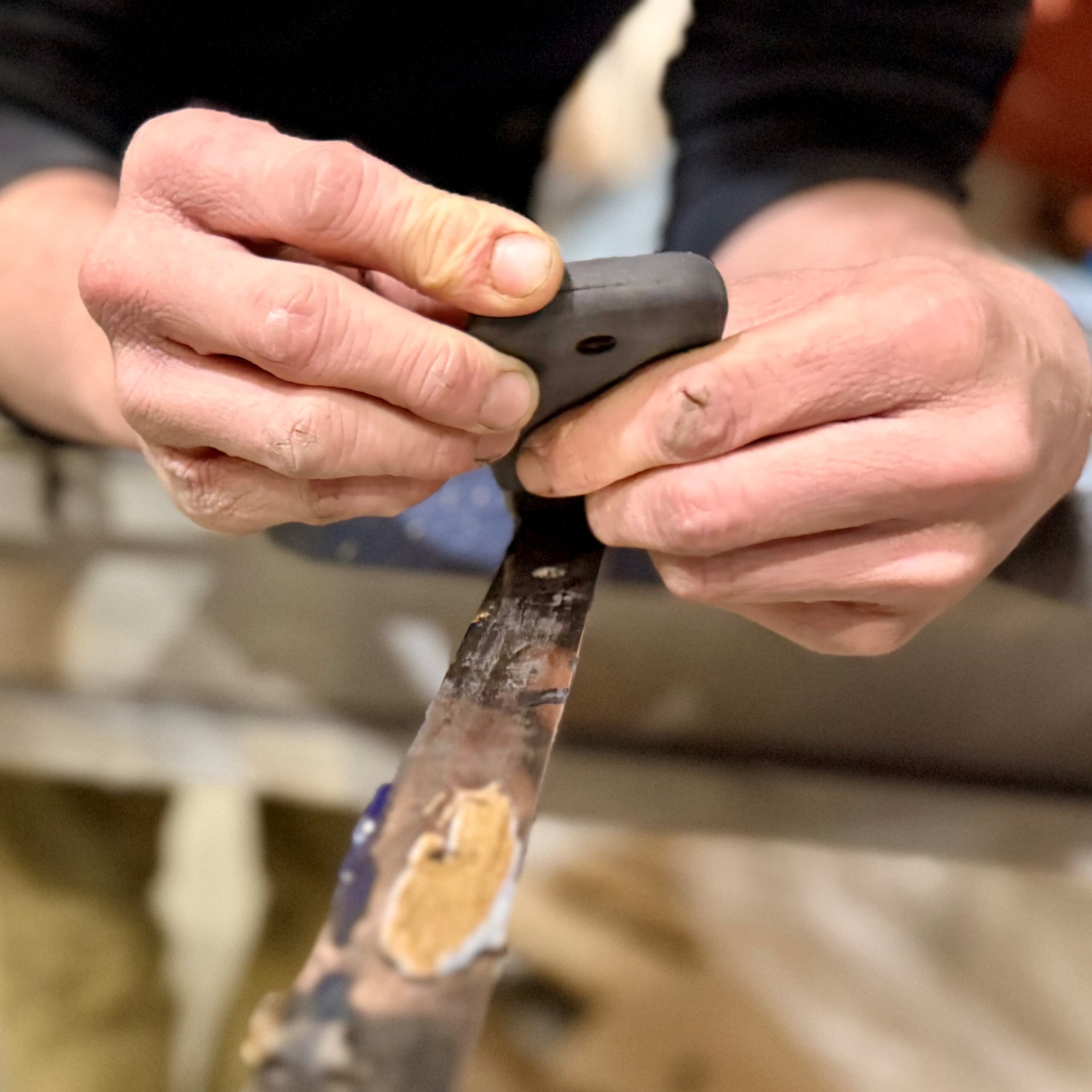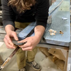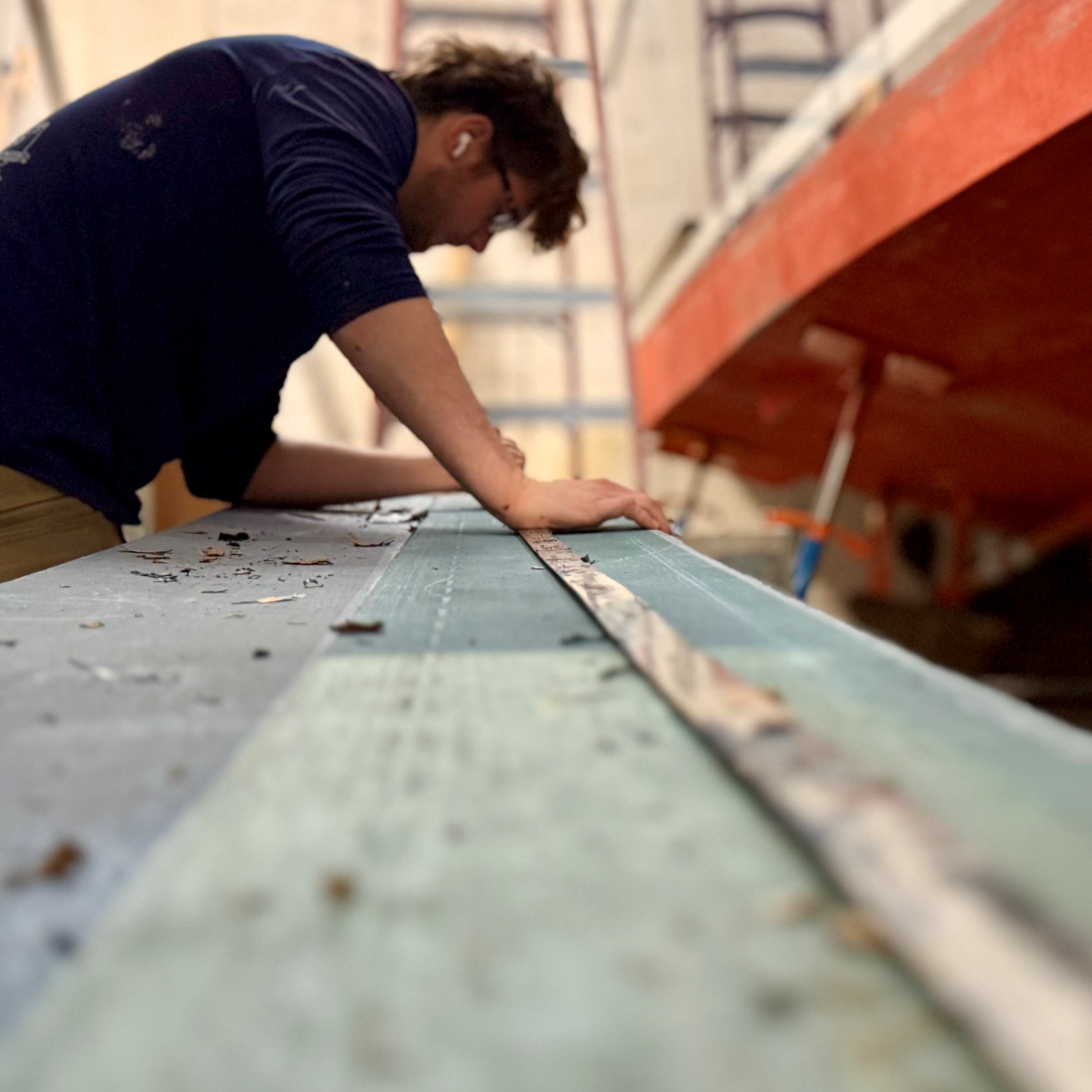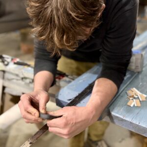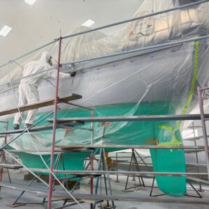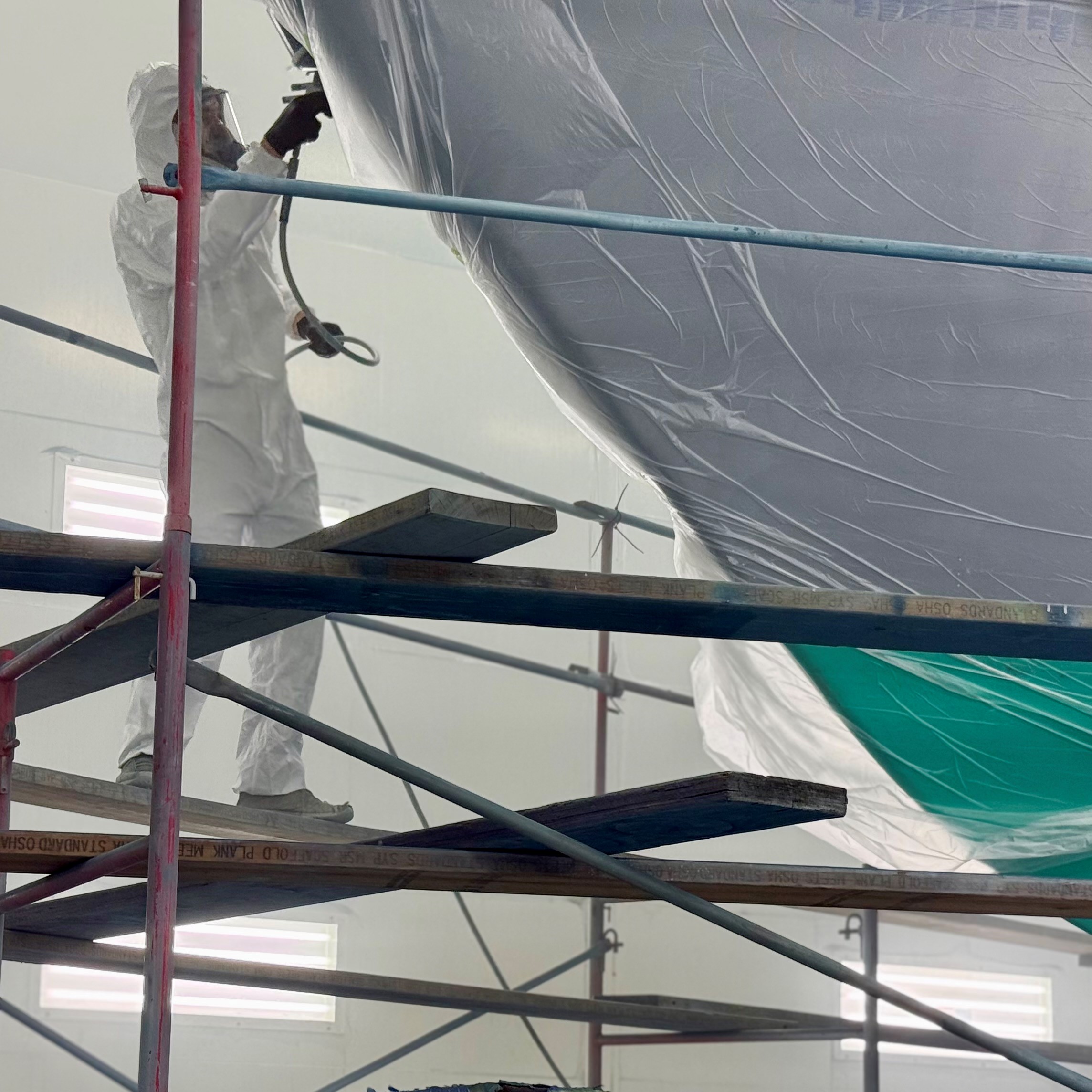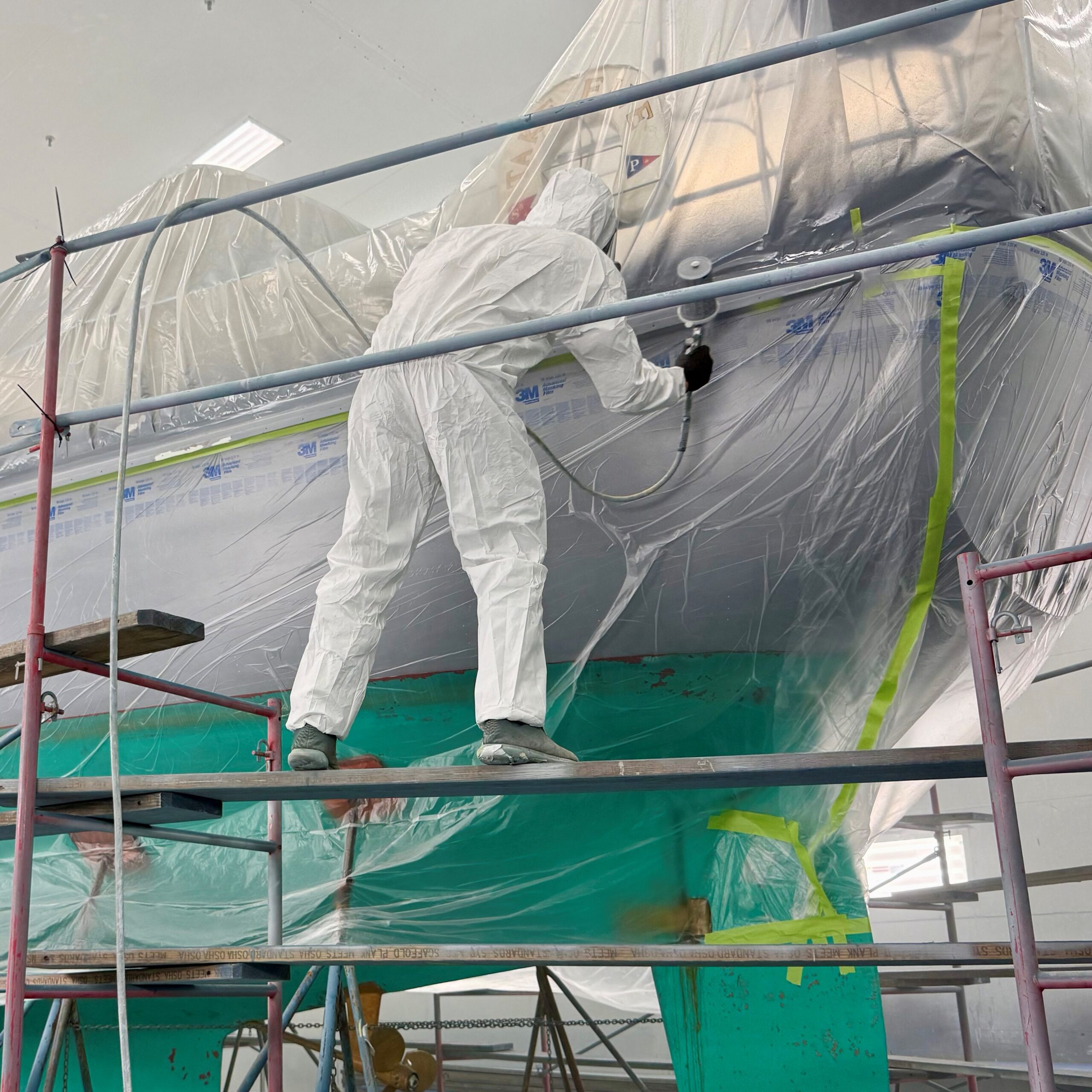 While the paint team primes and preps the hull and rail on a Little Harbor 53, the yard crew is preparing the stainless half round for remounting. By removing old adhesive and bits of wood from the back side, the team is ensuring a flush mount when this accent piece is reinstalled. Before the rail goes back in place, it will also be carefully polished. Taking care of such details matters, as a nice new paint job can really make an old, tarnished rail stand out – and not in a good way! With this simple extra step, the stainless rail will look fresh and sharp once atop the new Awlgrip finish.