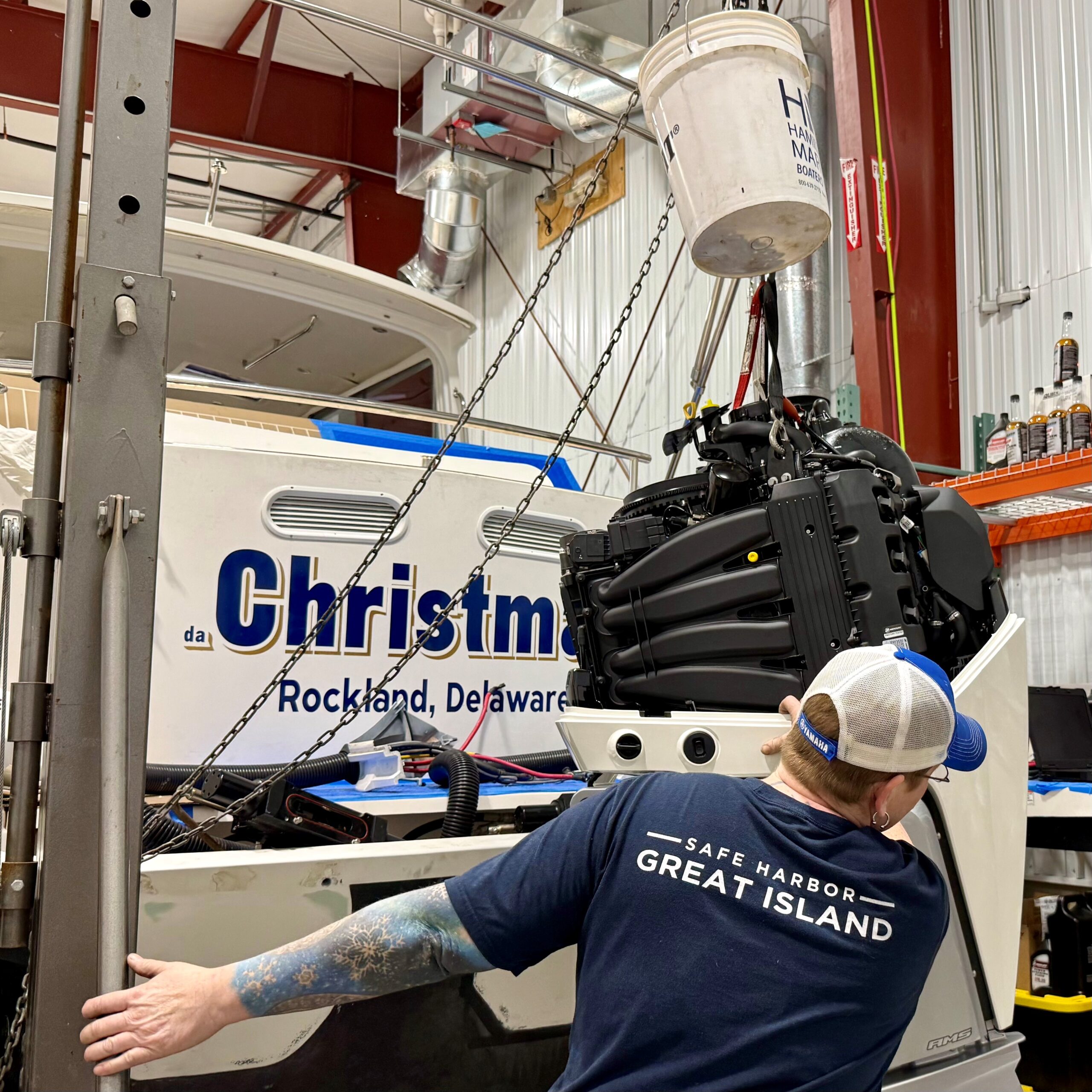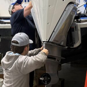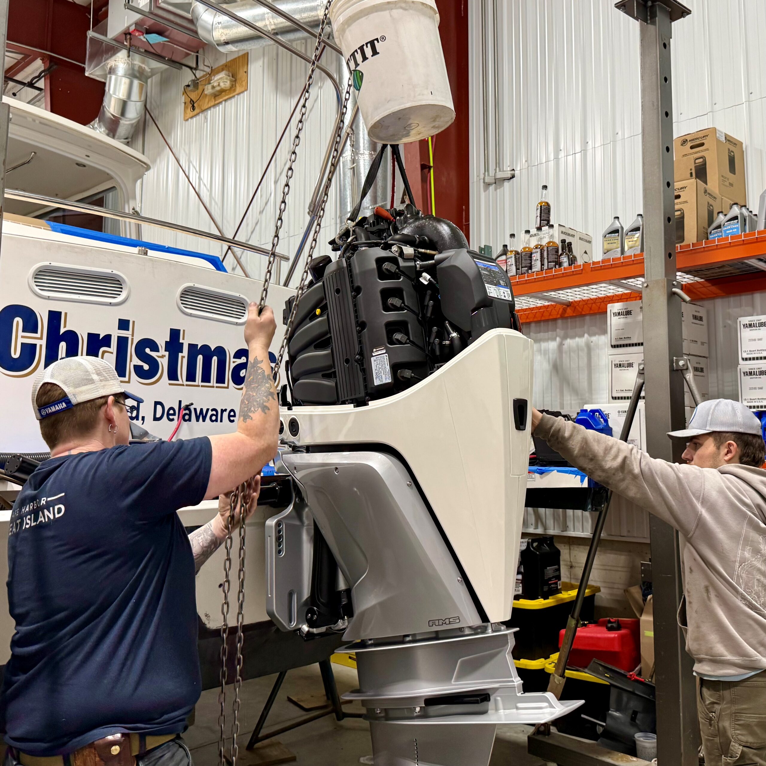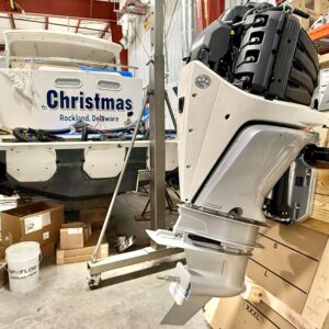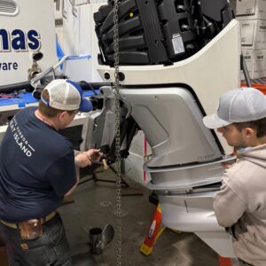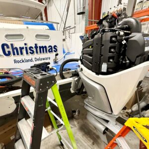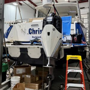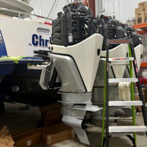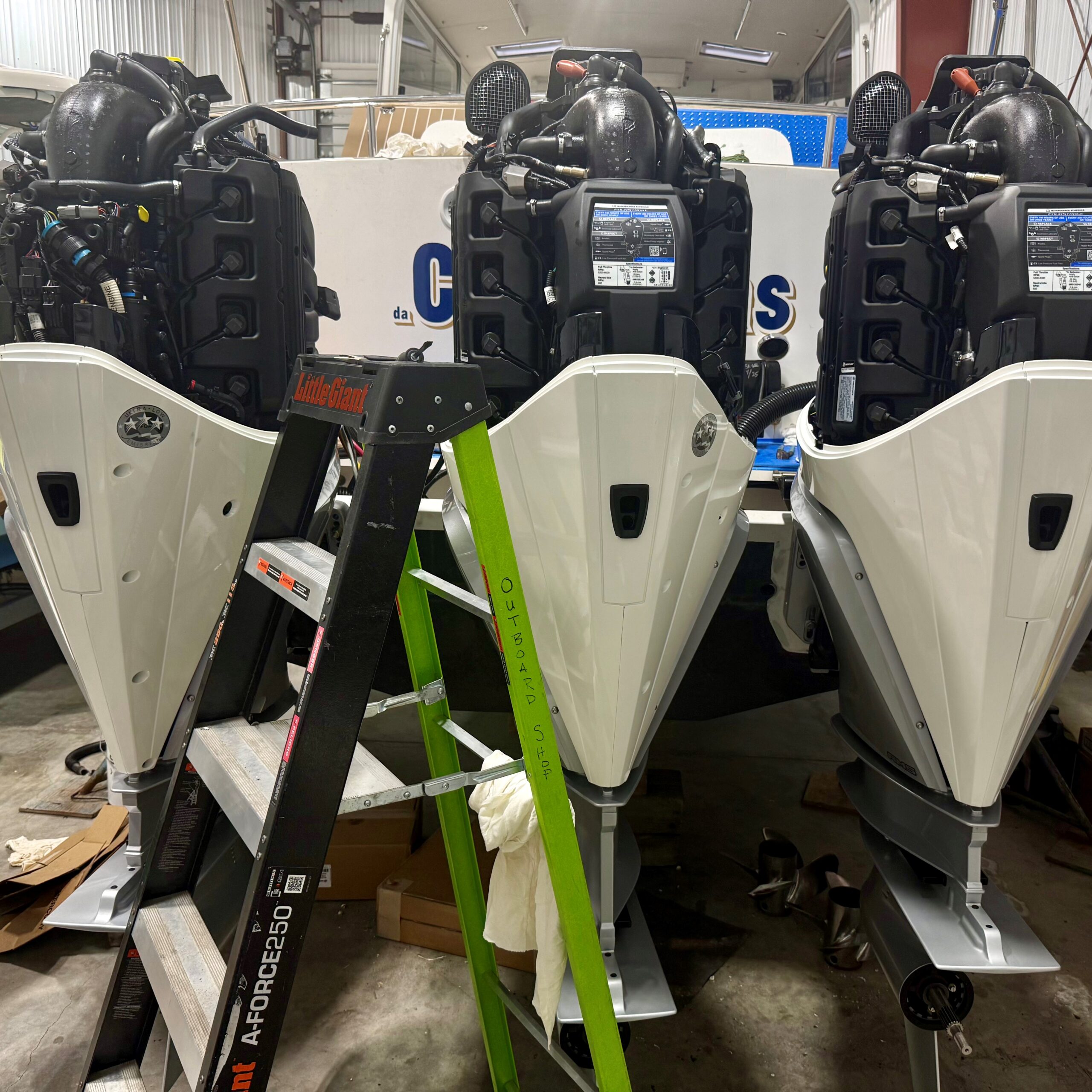 Three new 300 hp Mercury outboards have been hung aboard an MJM 43. Once fully secured and rigged, a deliberate break-in period per manufacturer’s specifications will complete the repower effort. By boating season, this boat will be ready to rip!