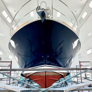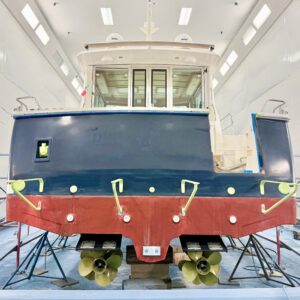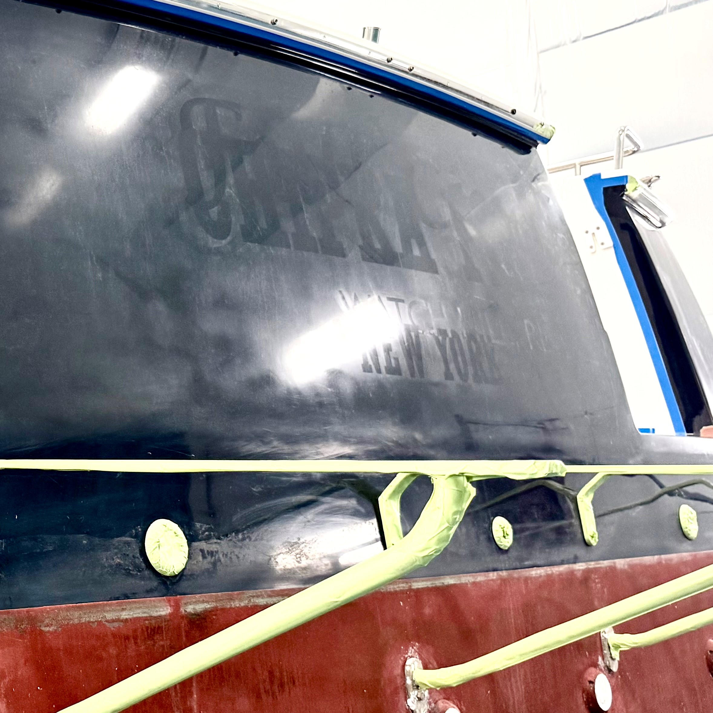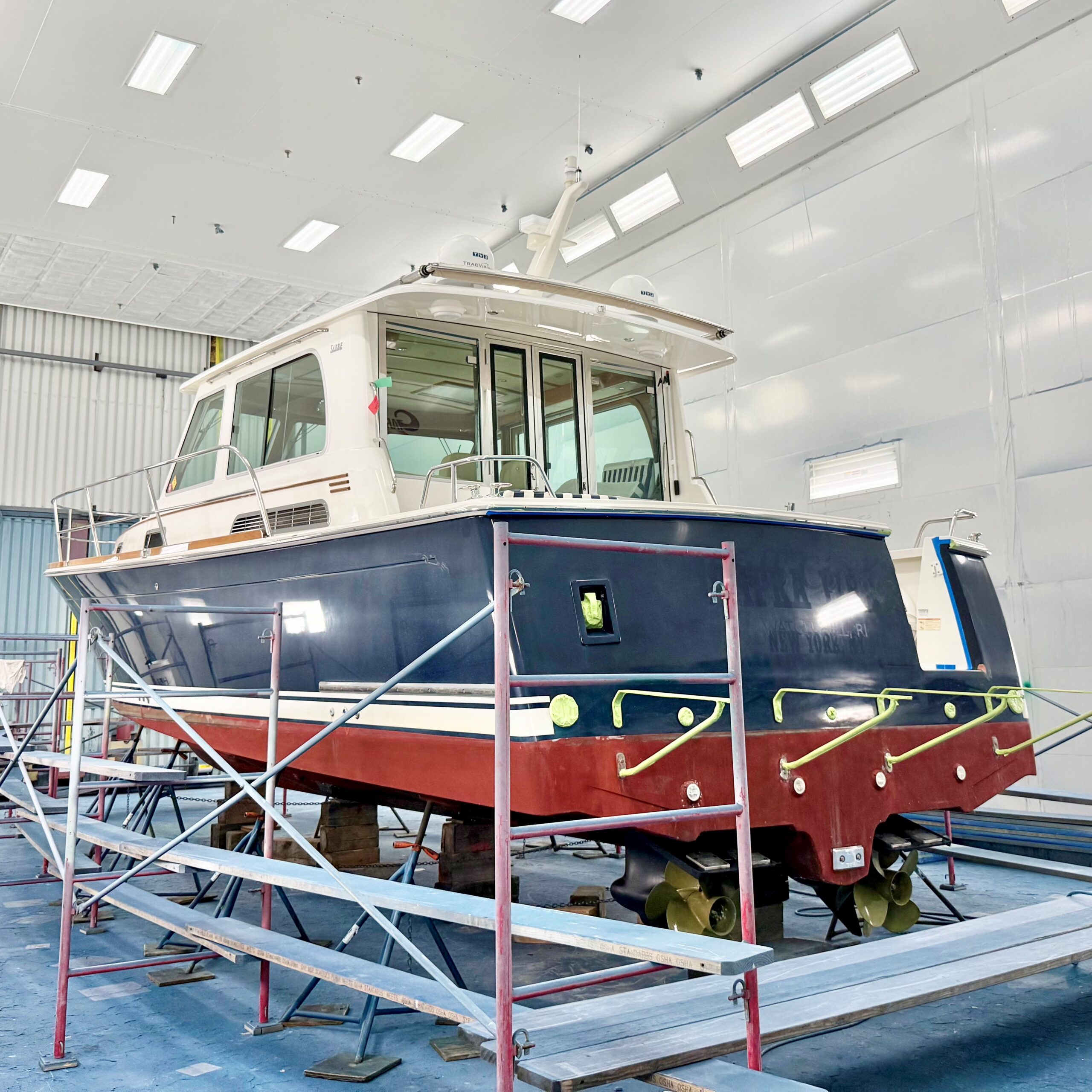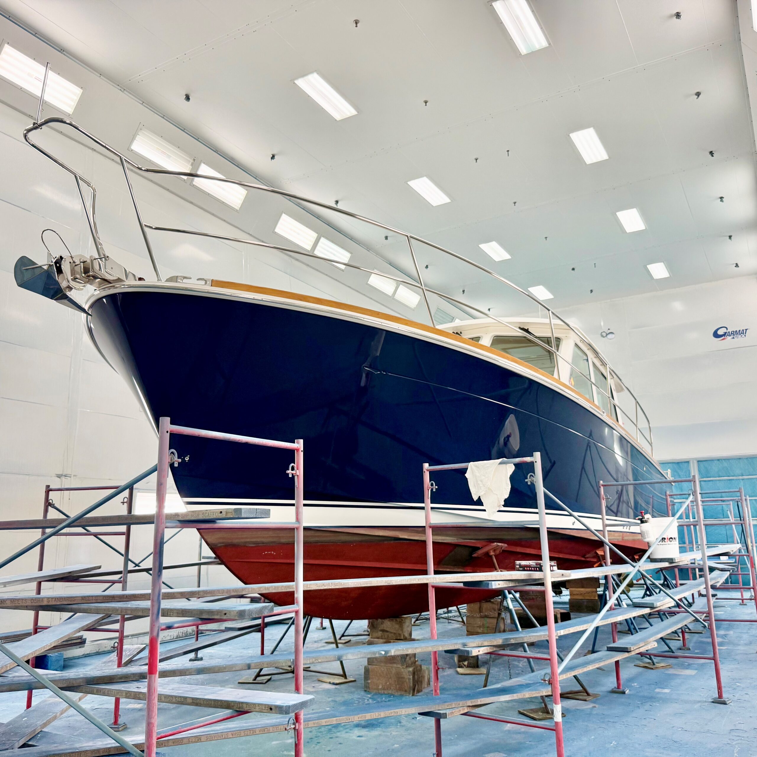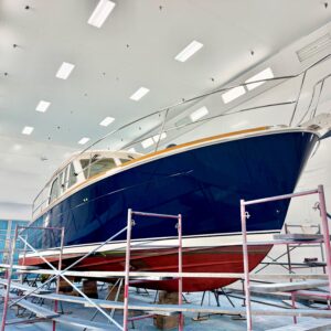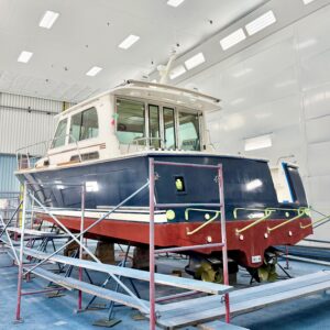 No rest for the weary. Our painters are already prepping their next hull for Awlgrip. Soon, this 2018 Sabre 42 Salon Express will be Claret Red with a Gold cove stripe, White boot stripe, and Black bottom. Sharp!