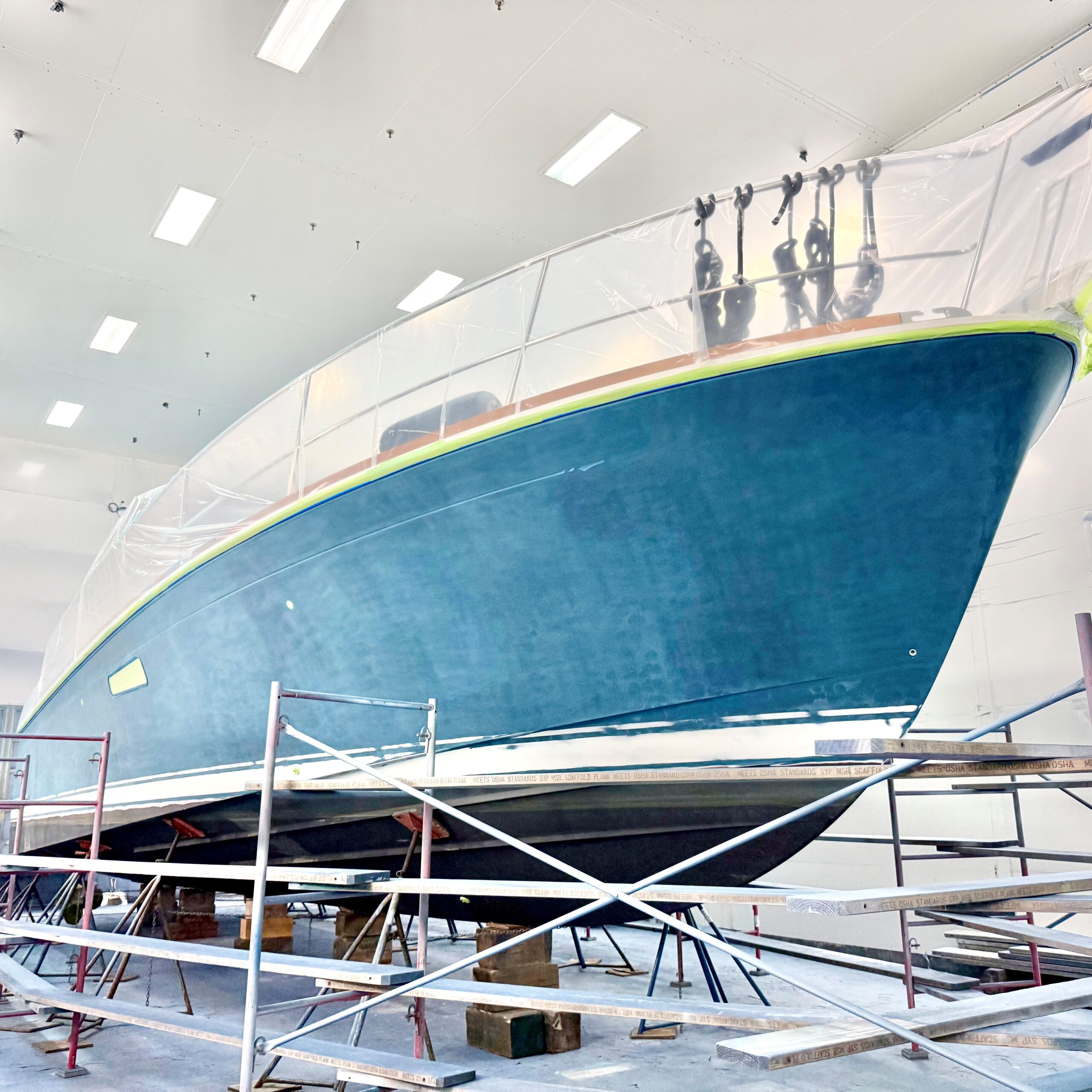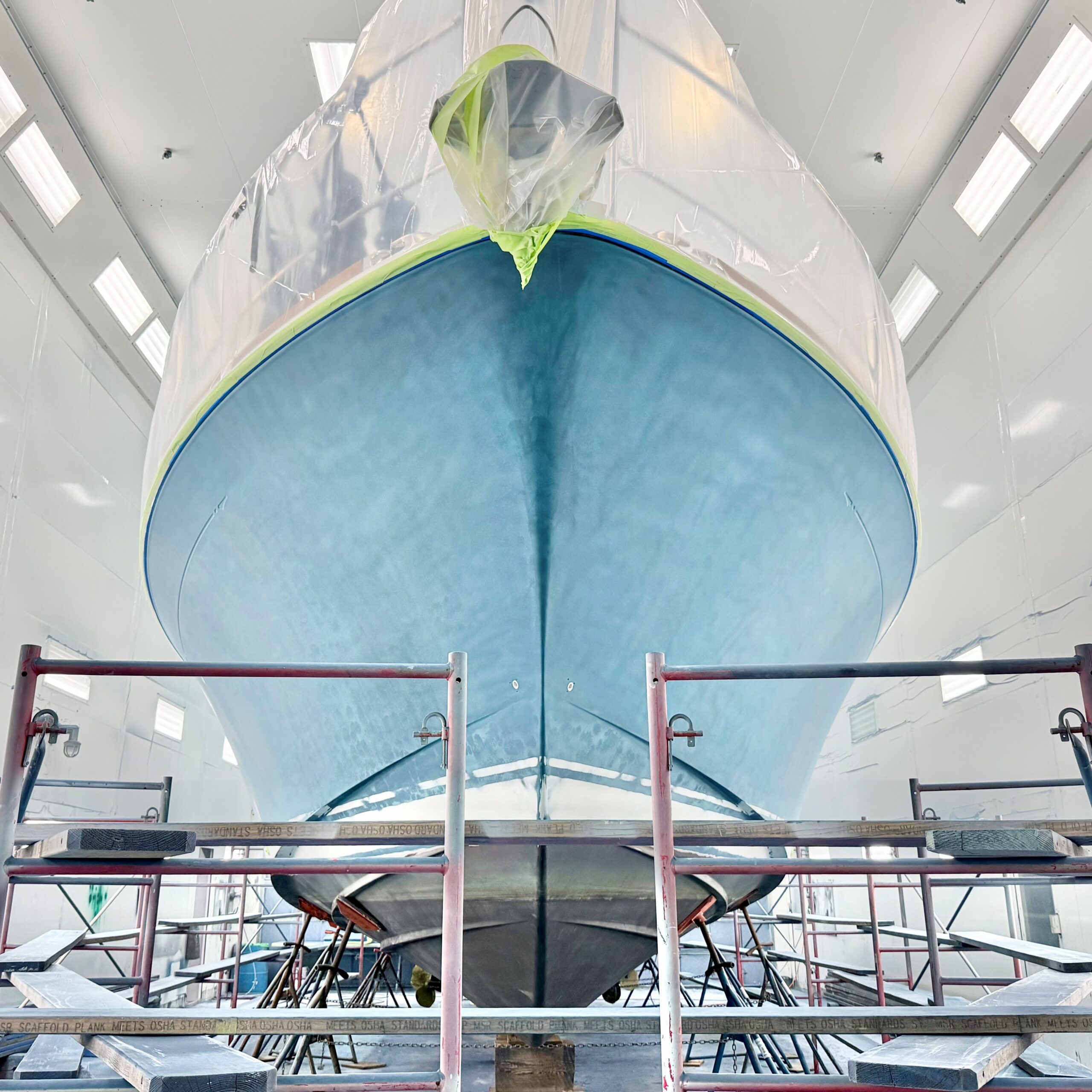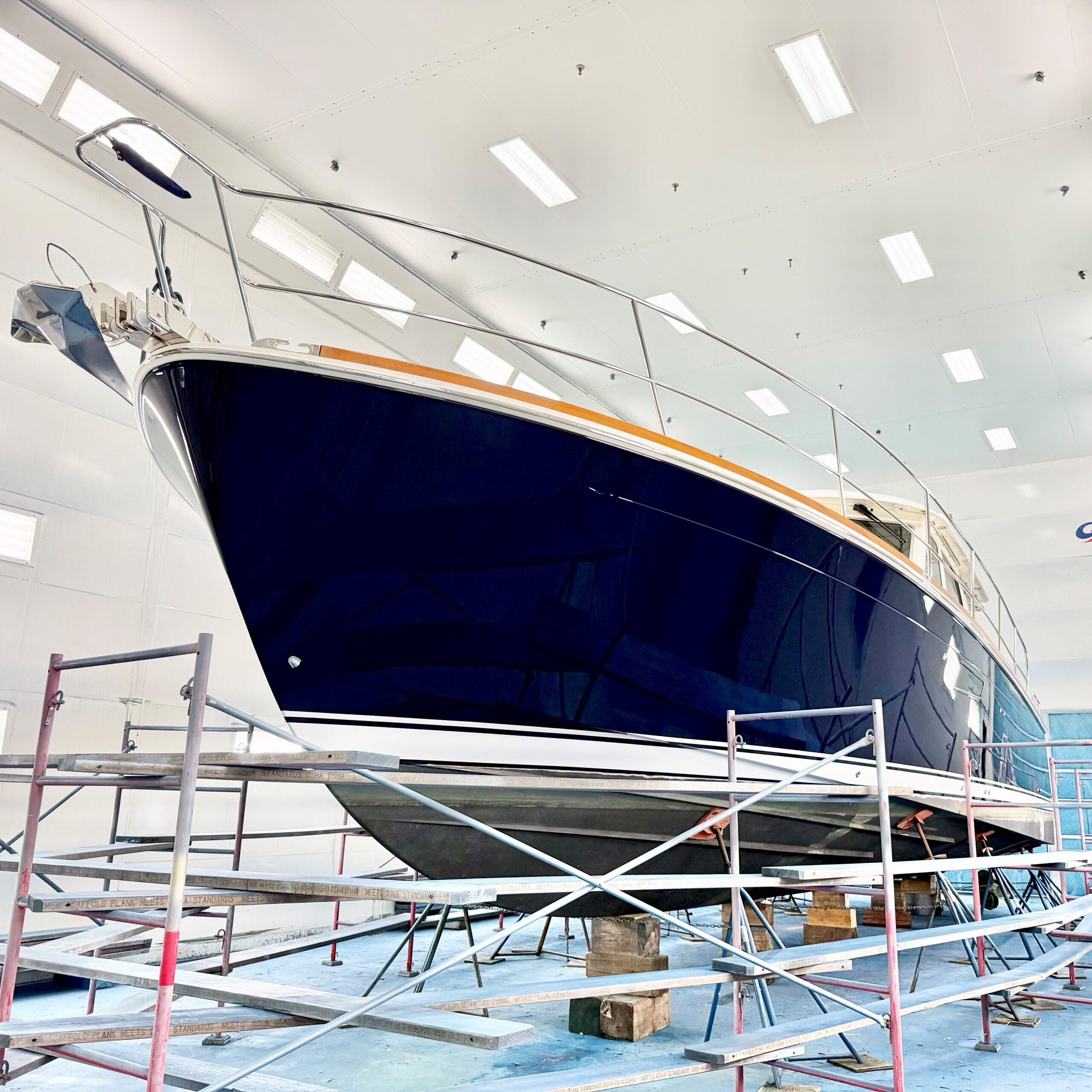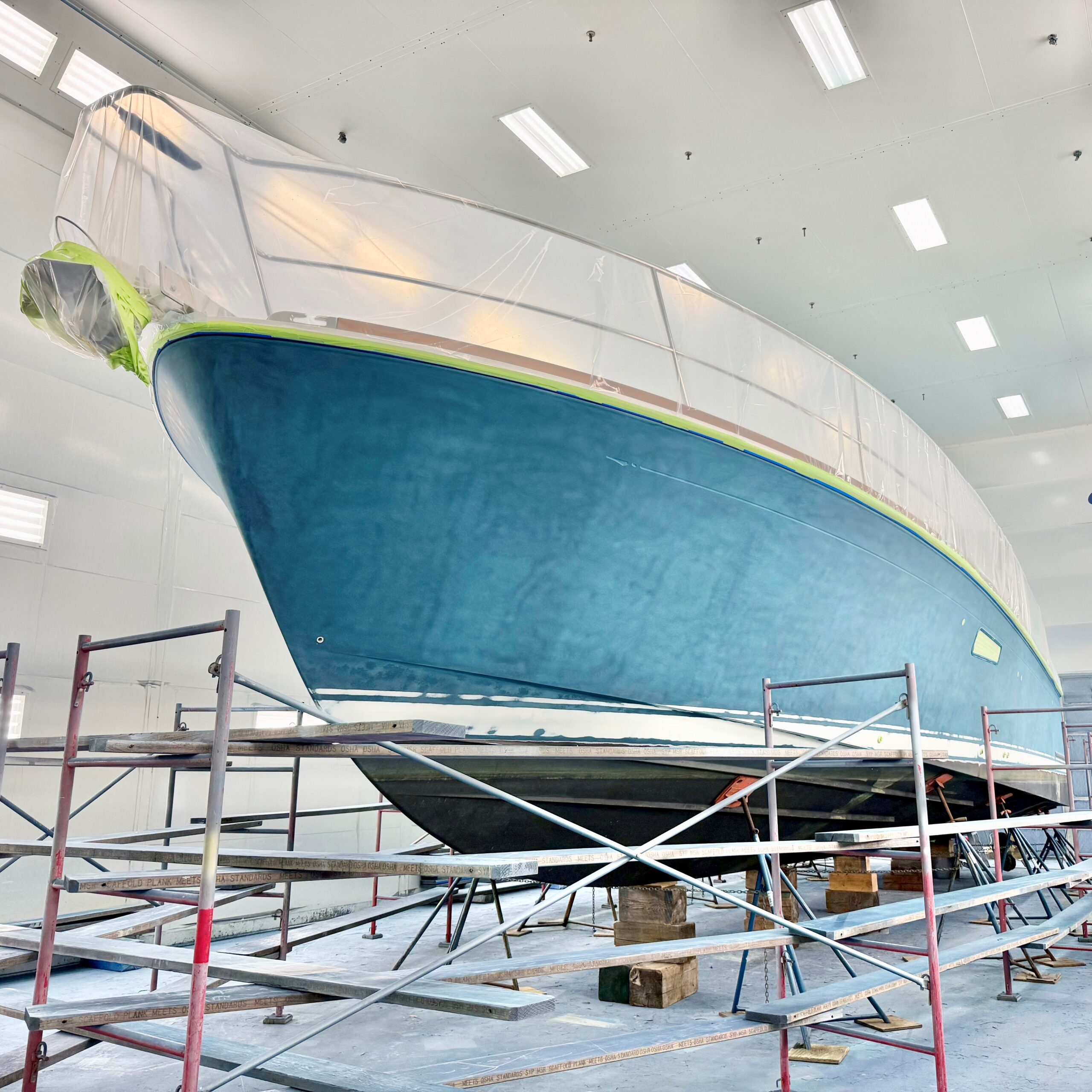 Here’s a fresh, new look for spring, summer, and beyond. This 2018 Sabre 48 is now sporting a new Midnight Blue Awlgrip finish. To get it right, our “grippers” disappeared imperfections with high build, then primed and painted the hull. The result is a smooth, dark, even finish – and a crisp, classic look!