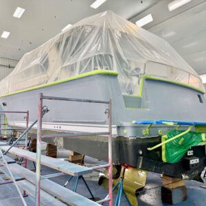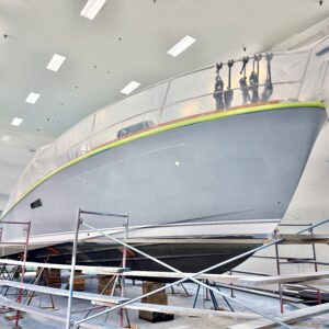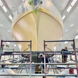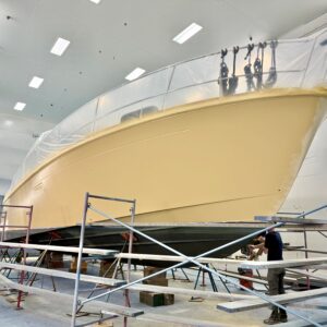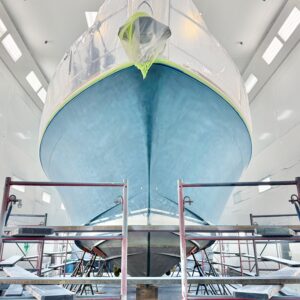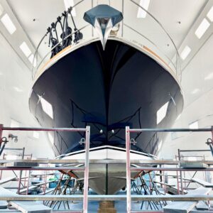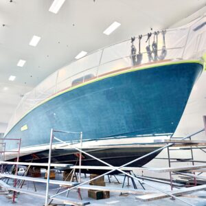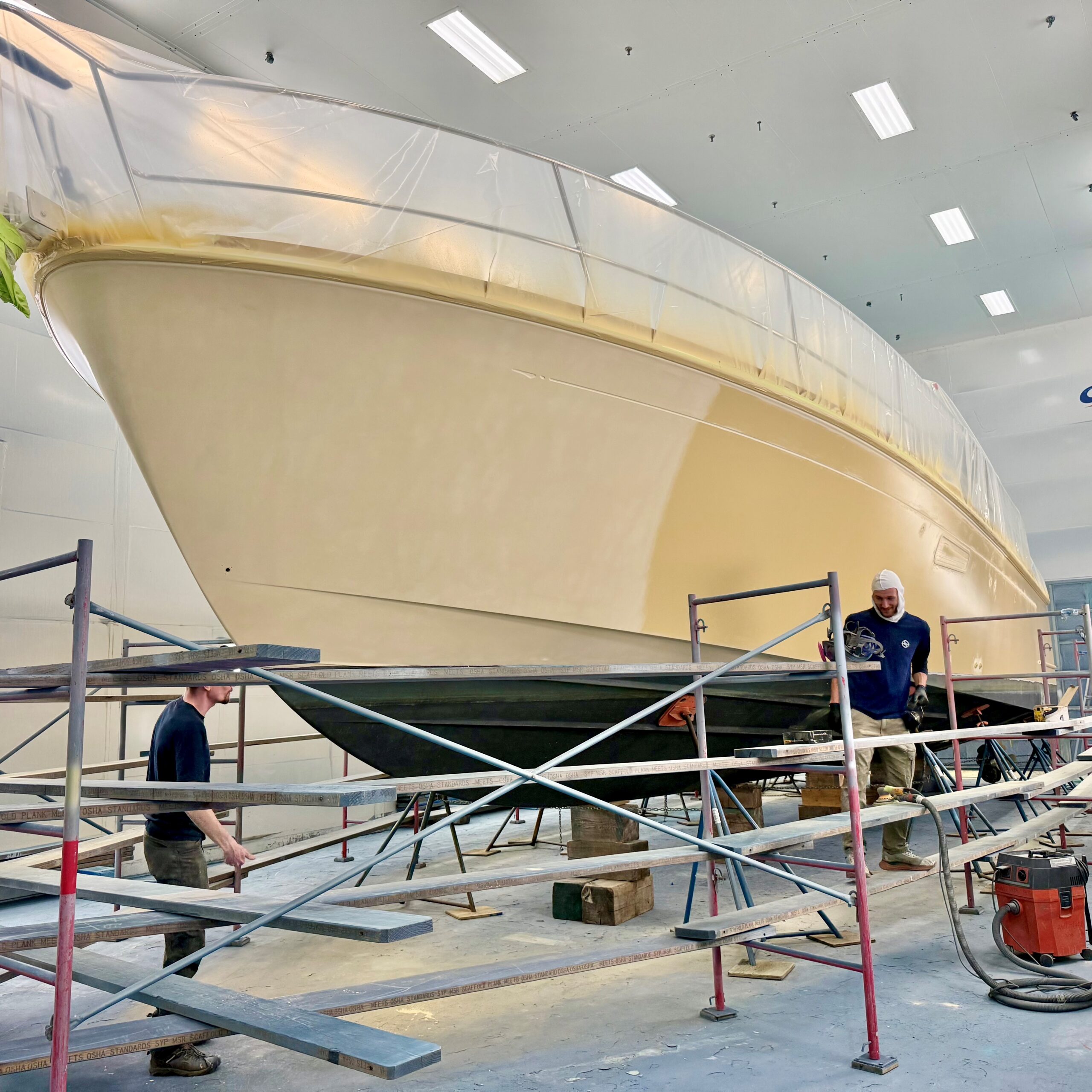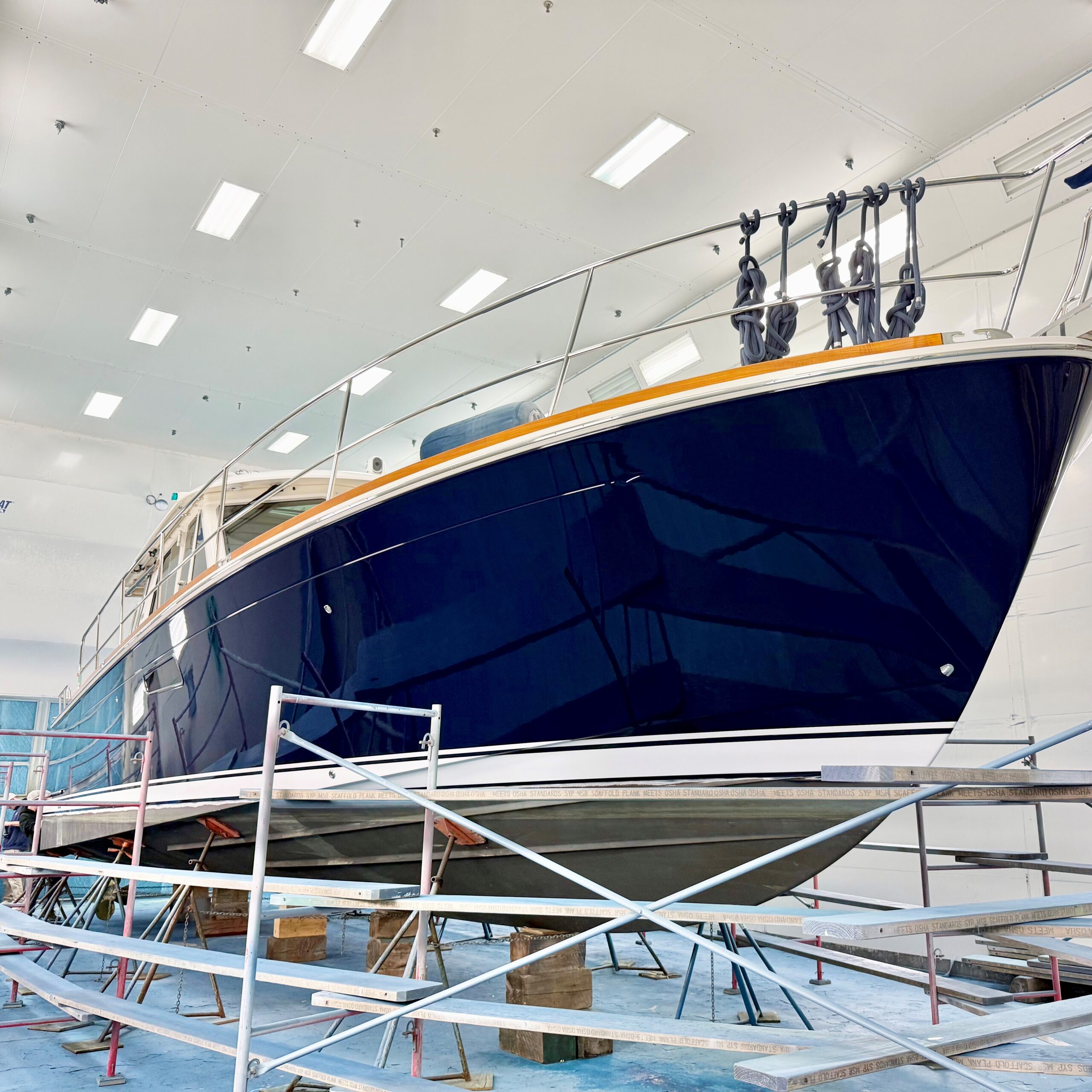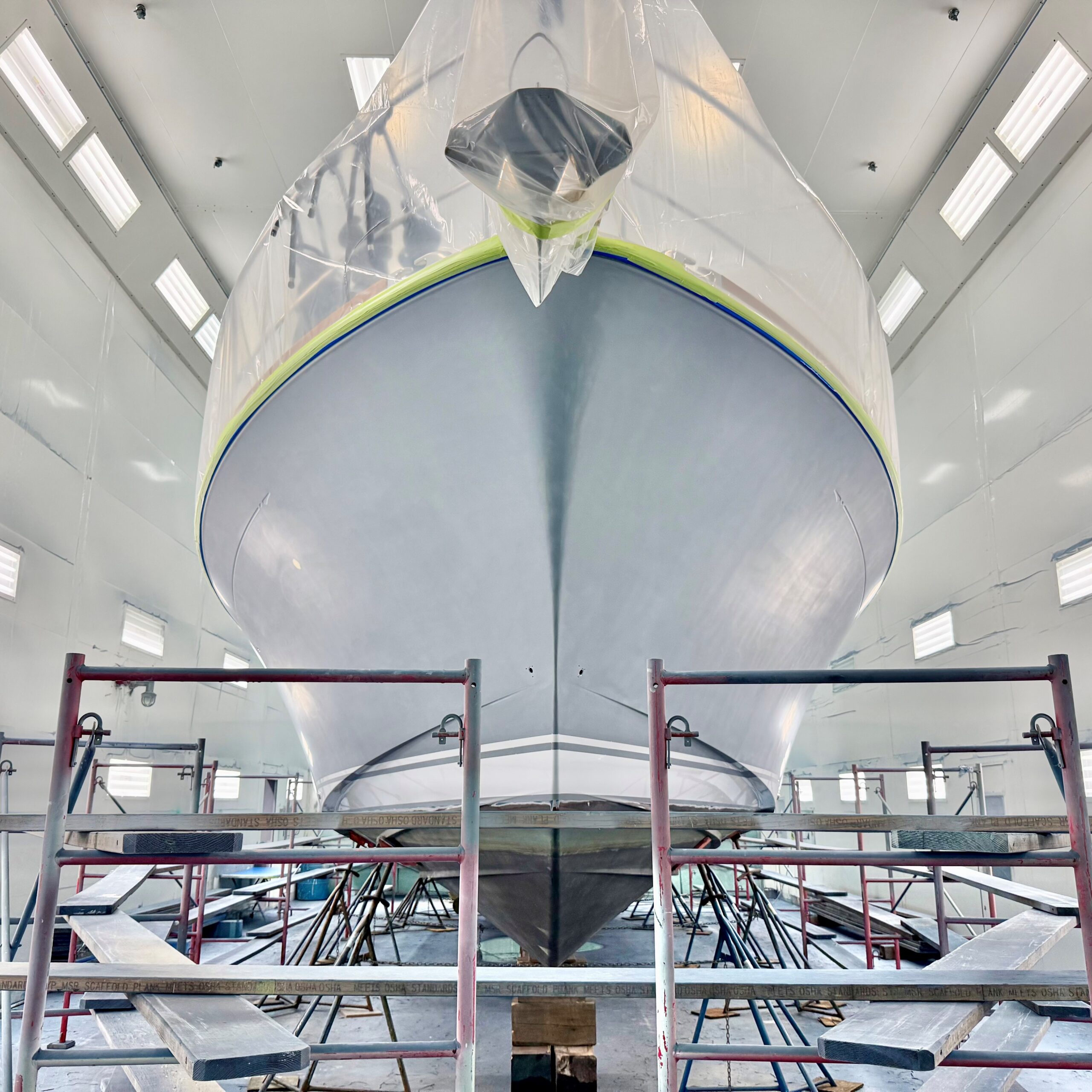 Here’s a fresh, new look for spring, summer, and beyond. This 2018 Sabre 48 is now sporting a new Midnight Blue Awlgrip finish. To get it right, our “grippers” disappeared imperfections with high build, then primed and painted the hull. The result is a smooth, dark, even finish – and a crisp, classic look!