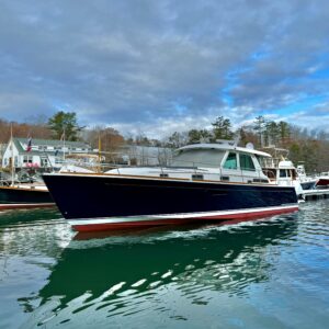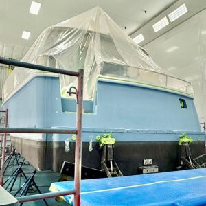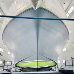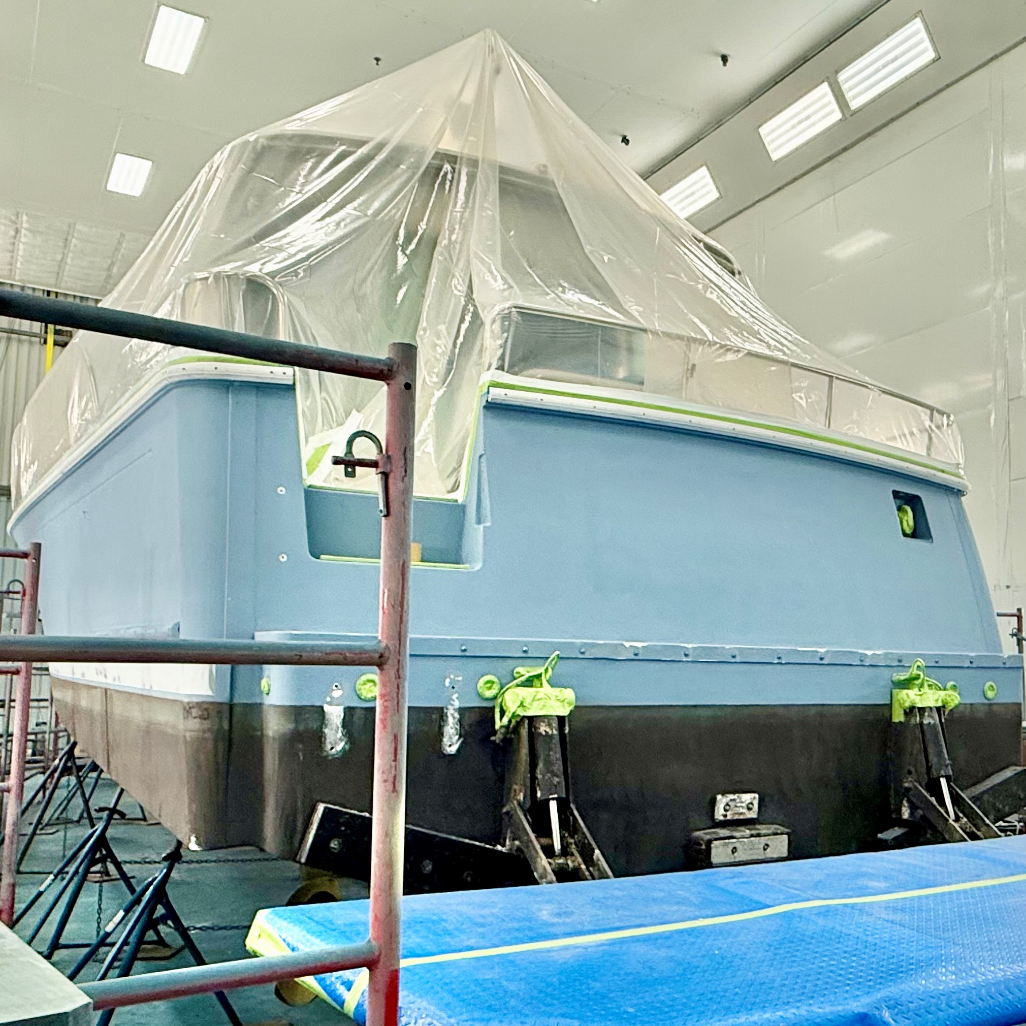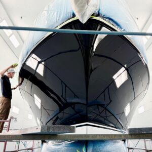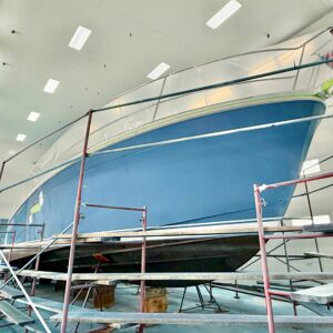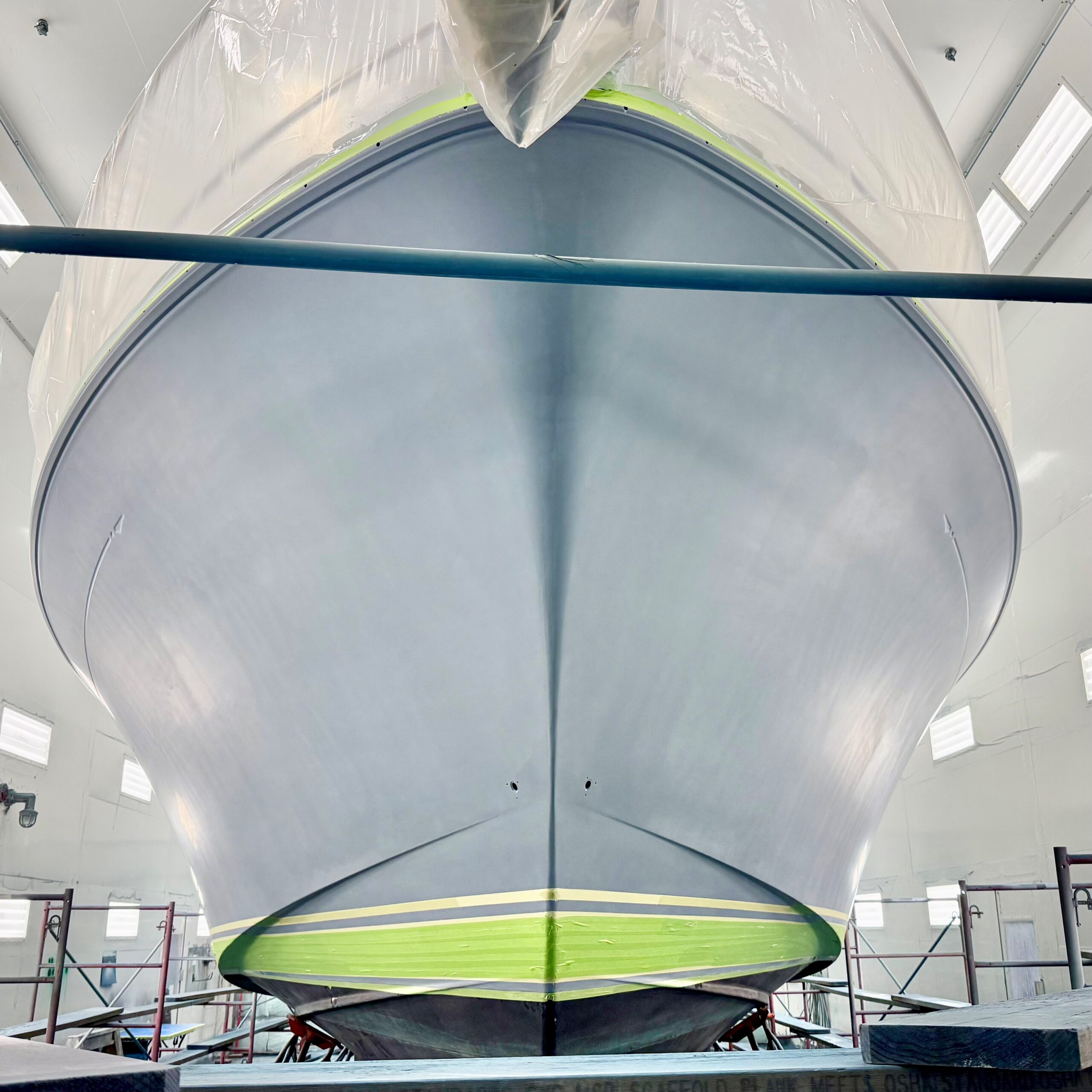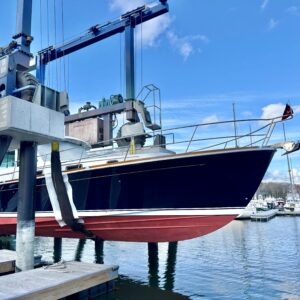 This lovely Sabre 48 is departing Safe Harbor Great Island today, following a fall visit to our paint bay. The boat arrived Stars & Stripes Blue; it is setting sail Flag Blue, with a completely new accent color scheme. Same boat, new look.