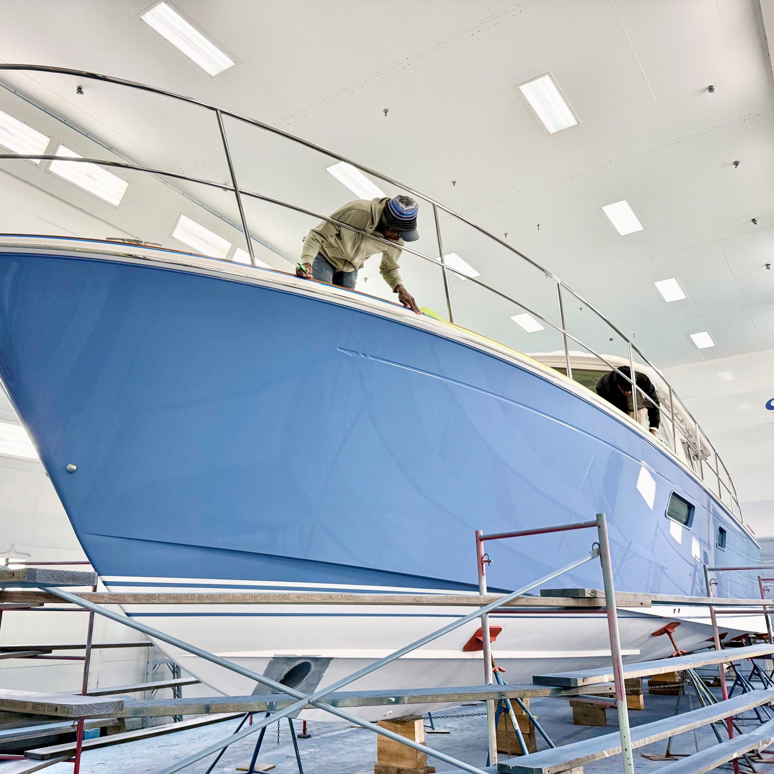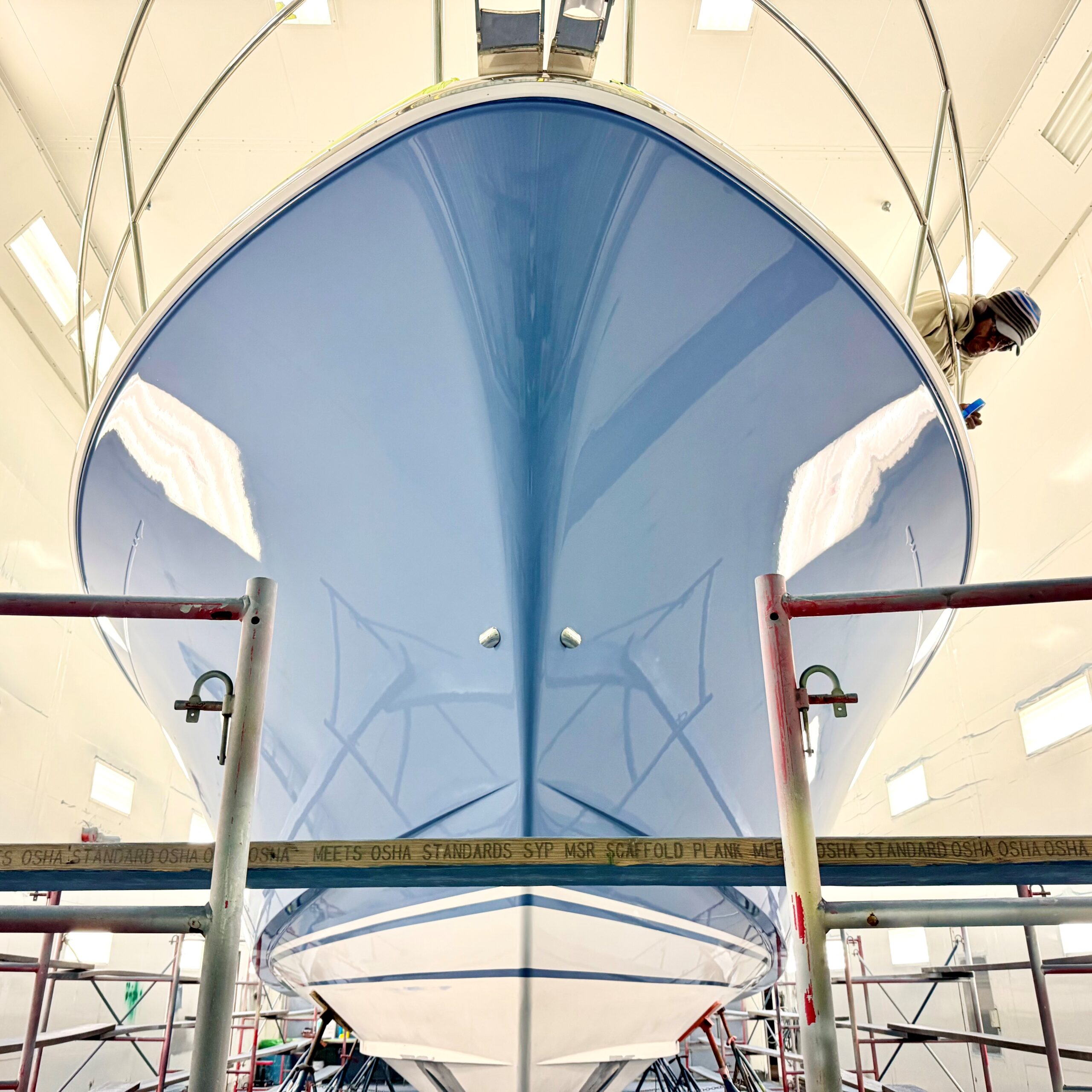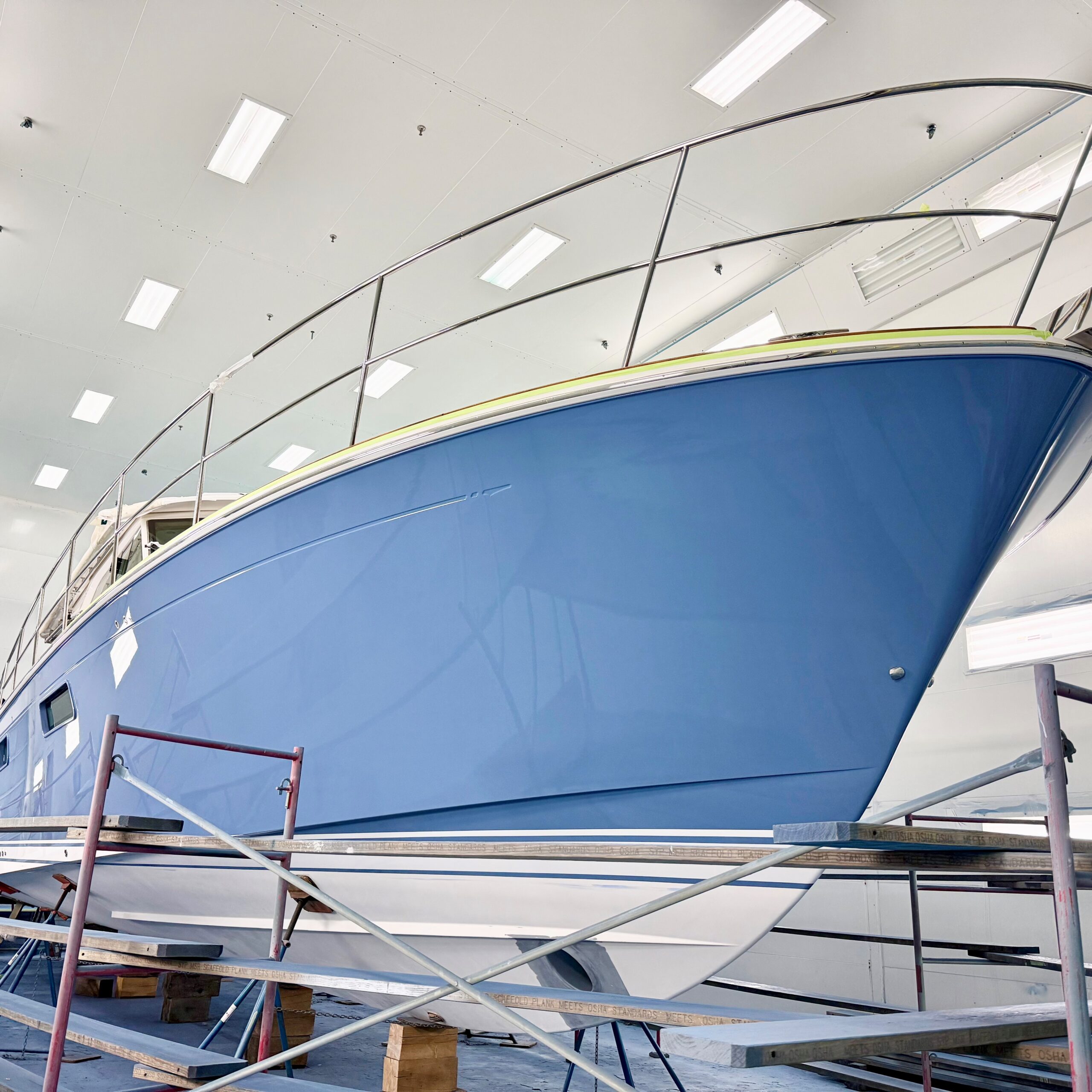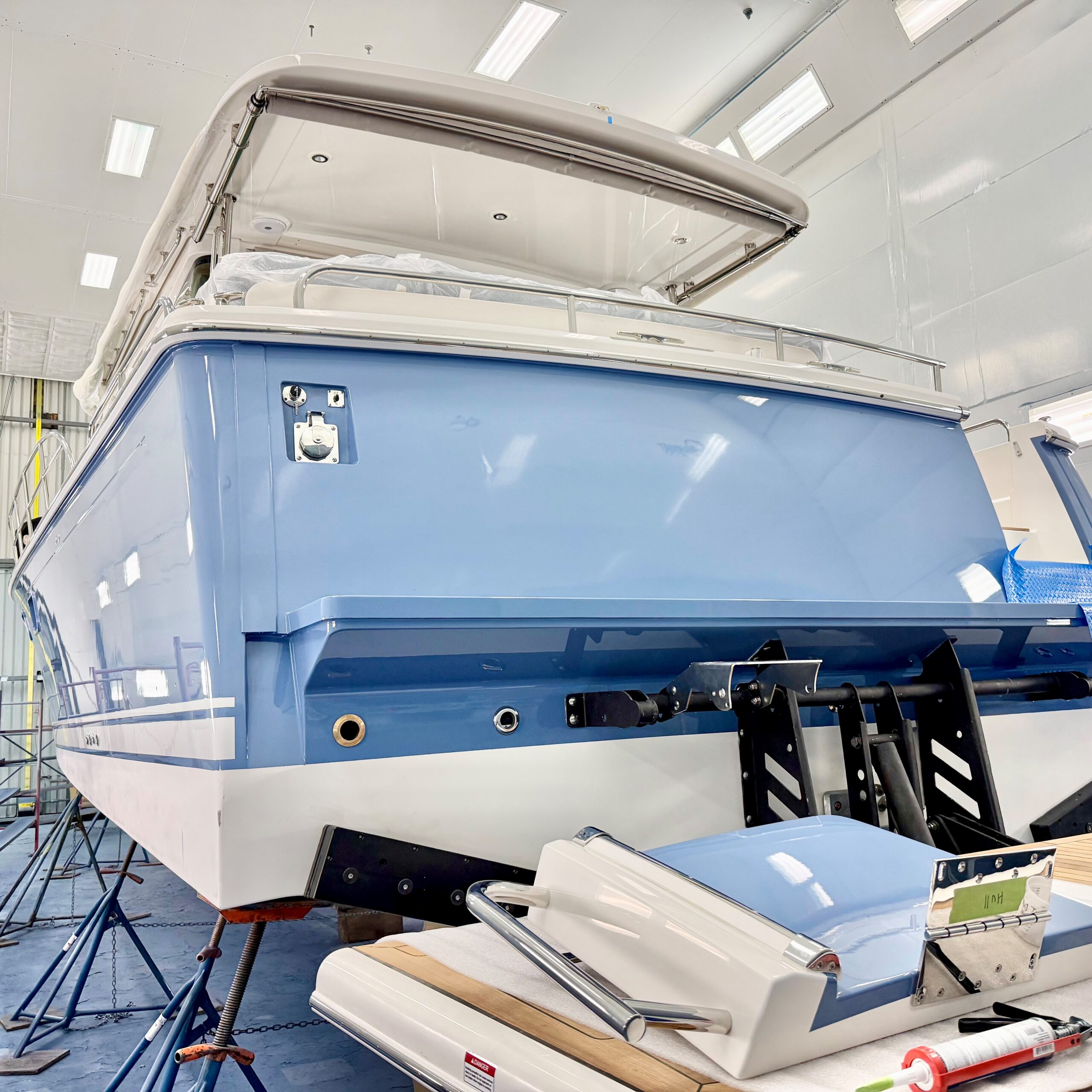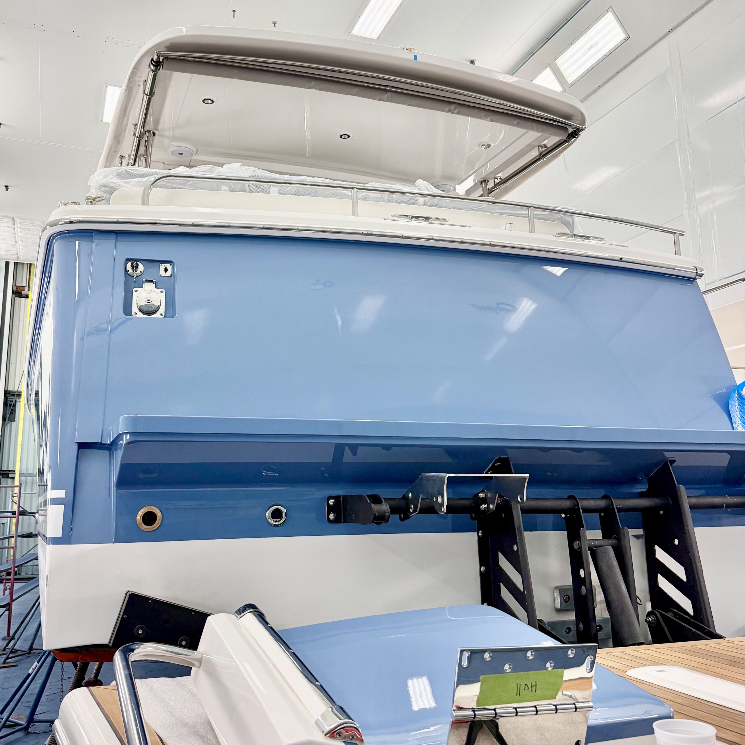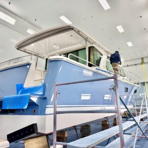 A Pigeon Blue Sabre 51 is nearing completion. Final exterior varnish is being applied now. Name, hail, cove stripe, and bottom paint will be applied next. We cannot wait to see this one outdoors, in all natural lighting. It’s going to look sharp!