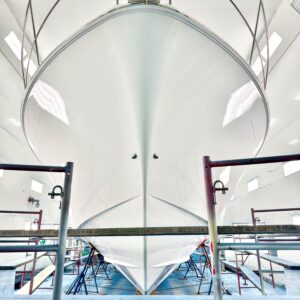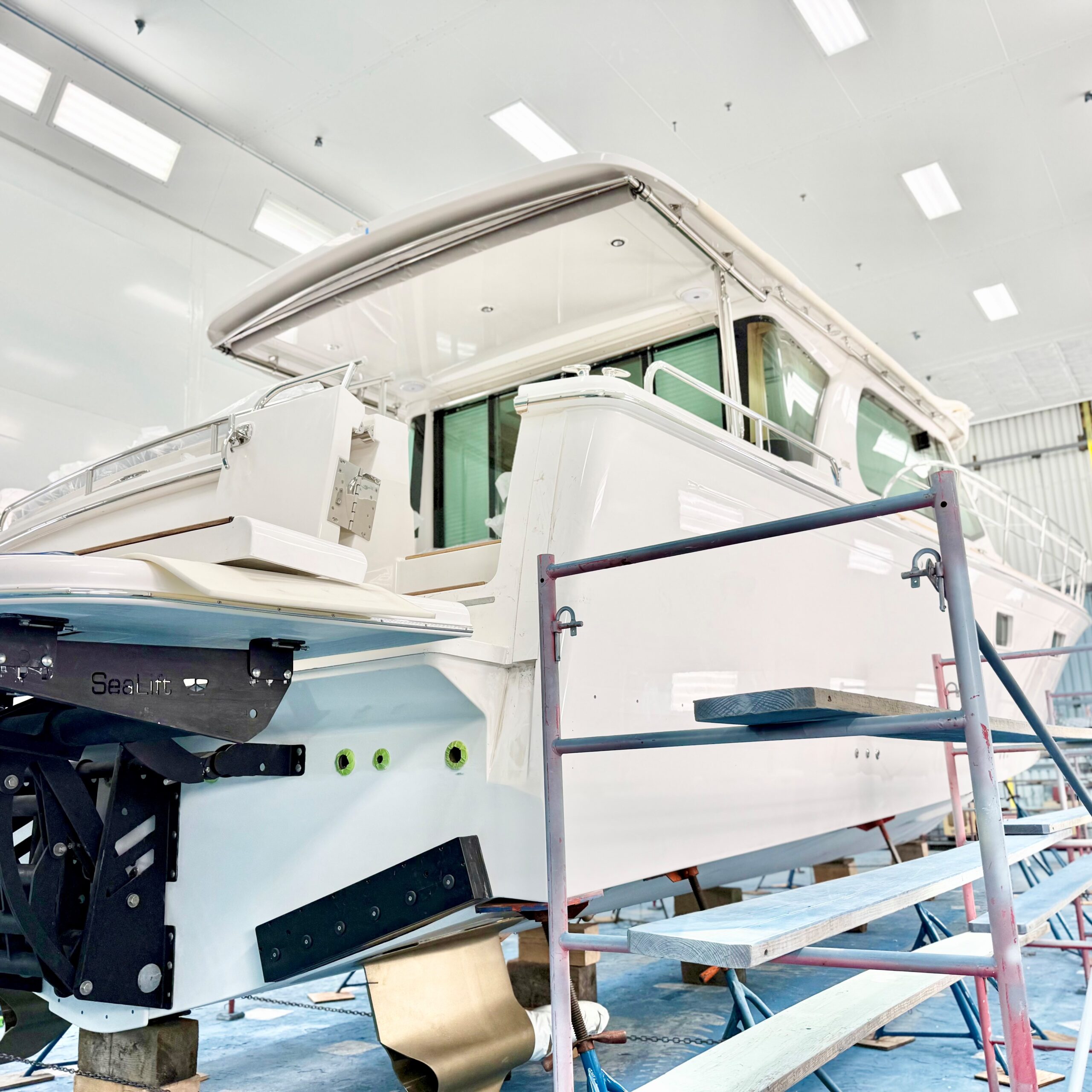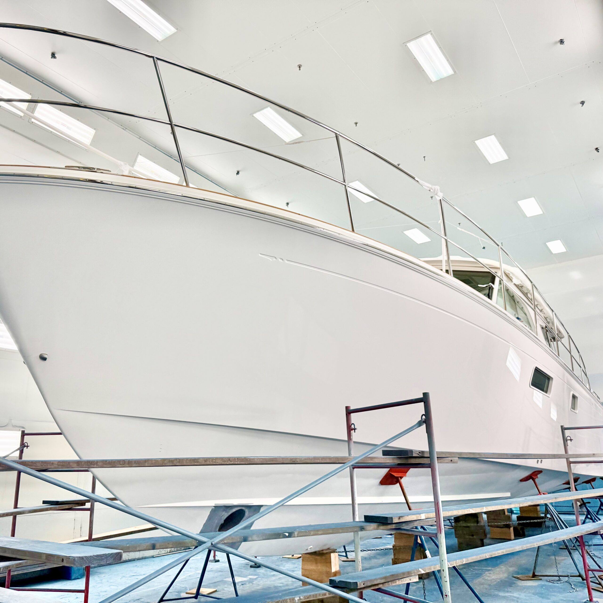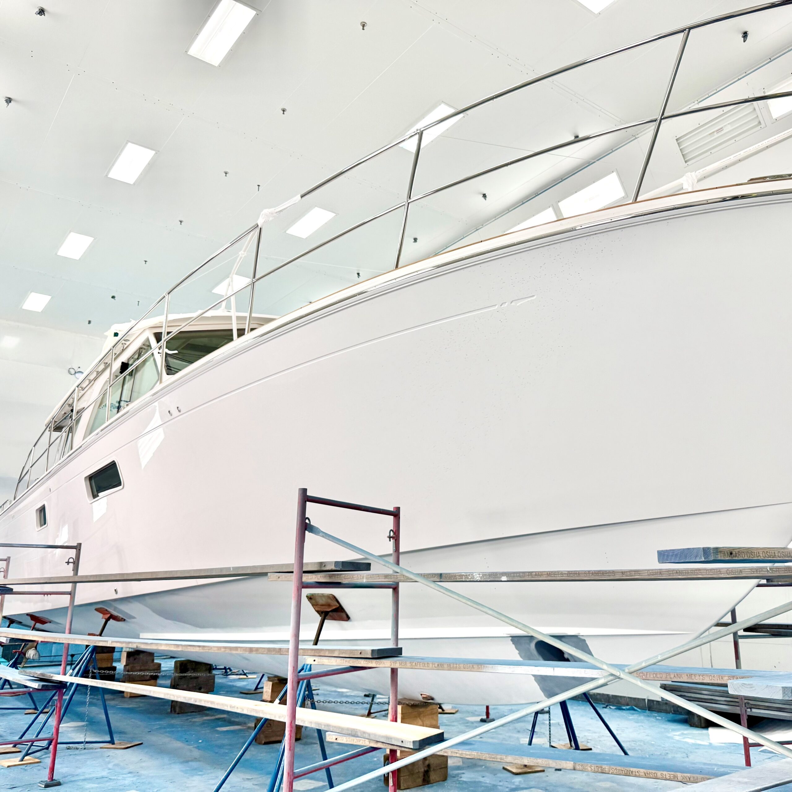 This new, fresh-out-of-the box Sabre 51 is being prepped for its very first paint job. Pigeon Blue hull. Signal White boot. Maybe a Silver cove stripe. With this original color scheme, it’s going to be a standout on the water. Our team is excited to unveil this one.